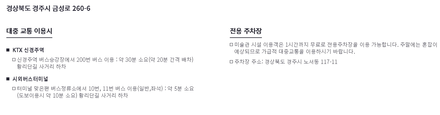 오아르미술관은 경주시 노서동 고분군 공원 부지에 위치해 있어, 접근성이 매우 좋습니다. 대중교통을 이용할 경우, 경주 시내에서 버스를 이용하면 쉽게 도착할 수 있습니다. 또한, 주변에 주차 공간도 마련되어 있어 자가용으로 방문하기에도 편리합니다.
