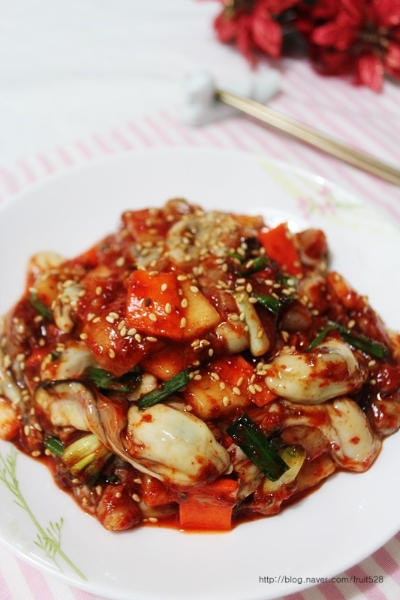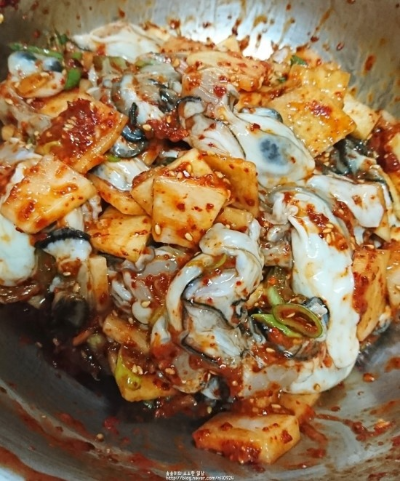 - 재료 섞기 : 준비한 굴과 채소를 양념장에 넣고 조심스럽게 버무려줍니다. 이때 굴이 부서지지 않도록 주의합니다.