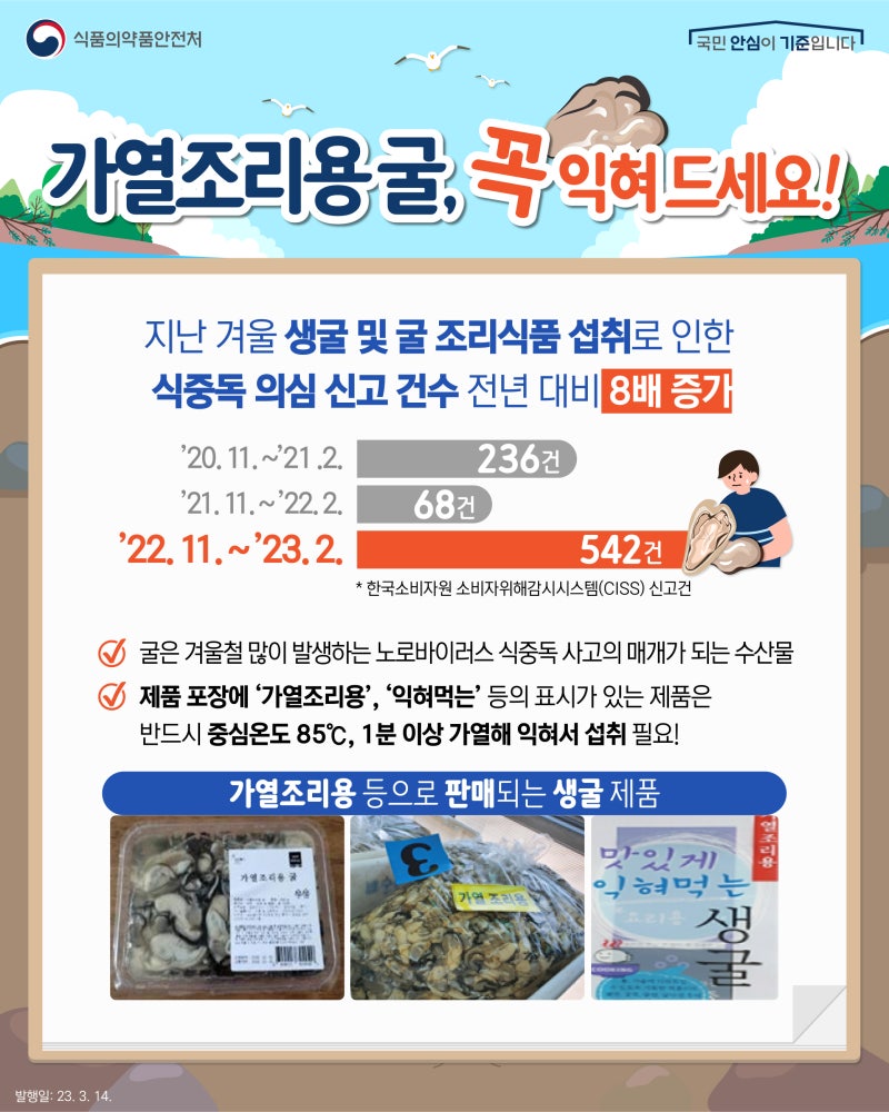 - '가열조리용' 또는 '익혀먹는' 등의 표시가 있는 제품은 꼭 중심온도 85도, 1분 이상 가열해 익혀서 섭취해야 합니다.