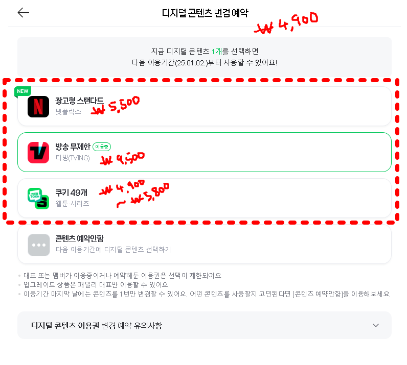또한, 카카오톡 이모티콘 플러스 등 몇몇 구독 요금제들은 가격을 올리기 전에 기존회원들에게는 1년간 요금을 동결하는 등의 모습을 보여왔기 때문에, 생각해 보시고 너무 늦지 않게 가입하세요! 아직은 4,900원입니다!