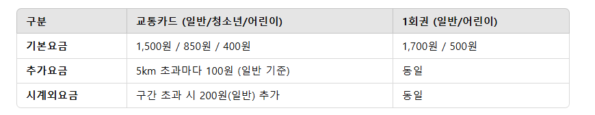 - 사용가능카드 : 티머니, 캐시비(이즐), 레일플러스, 선불형 k패스, 대부분의 후불 신용카드