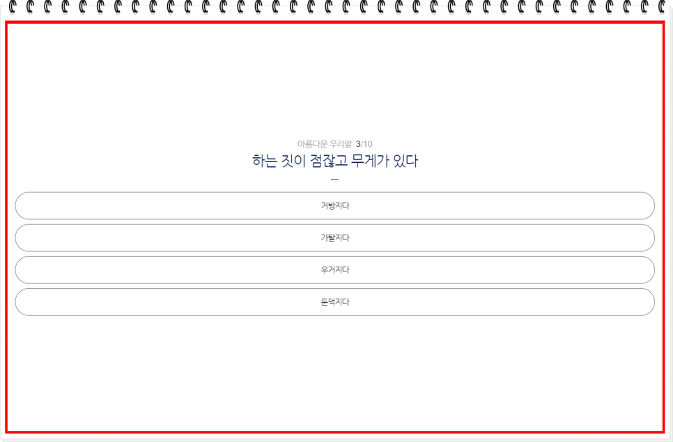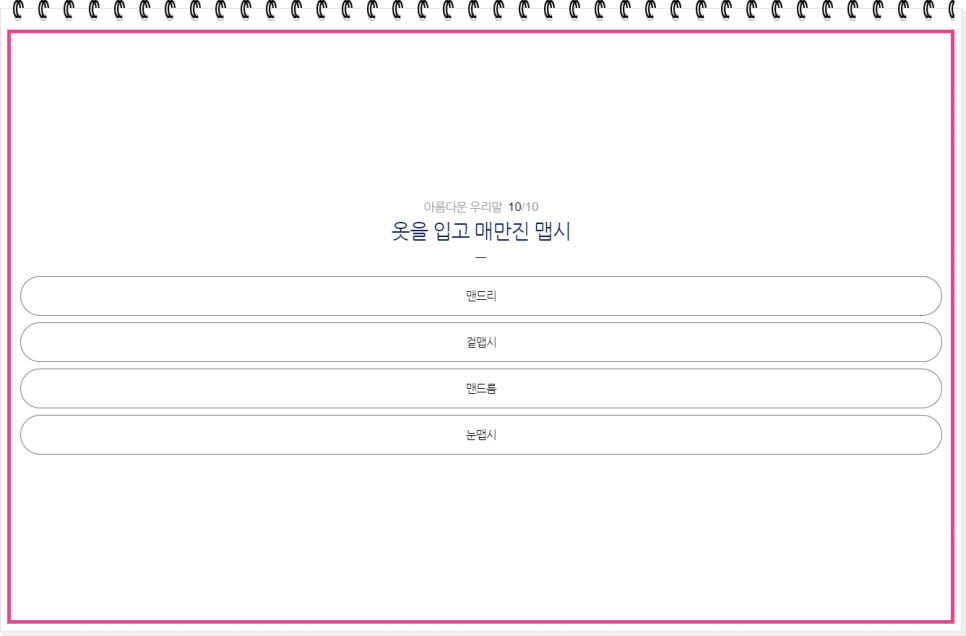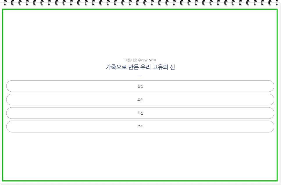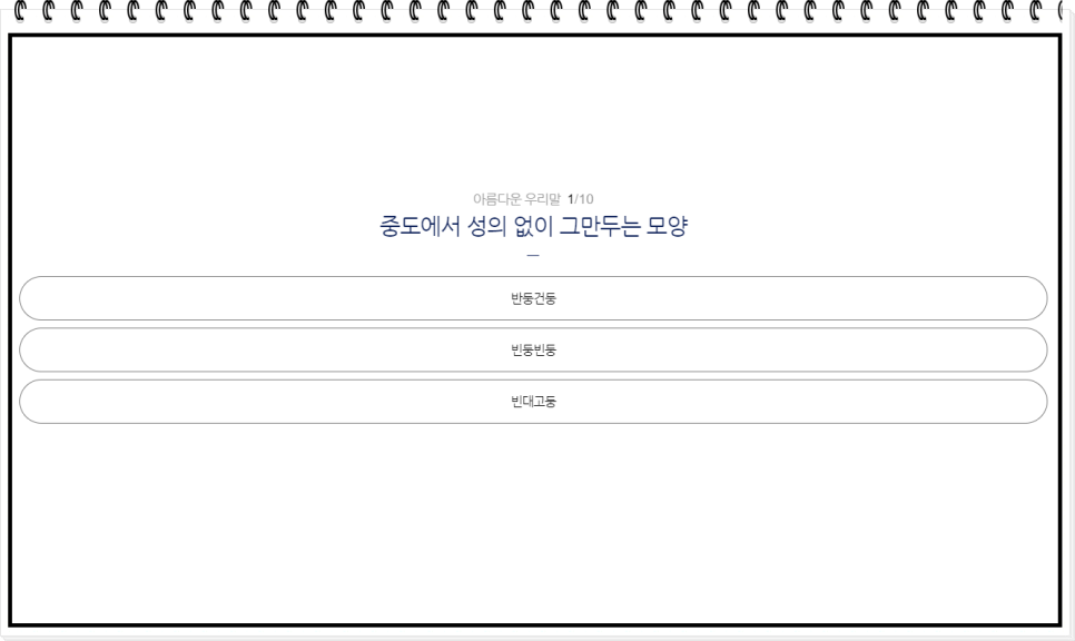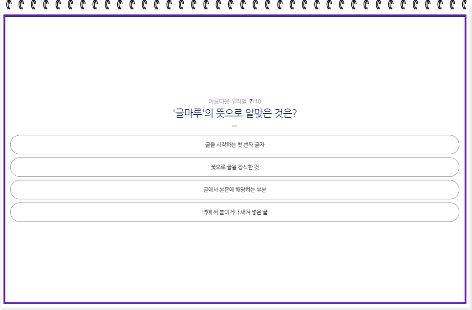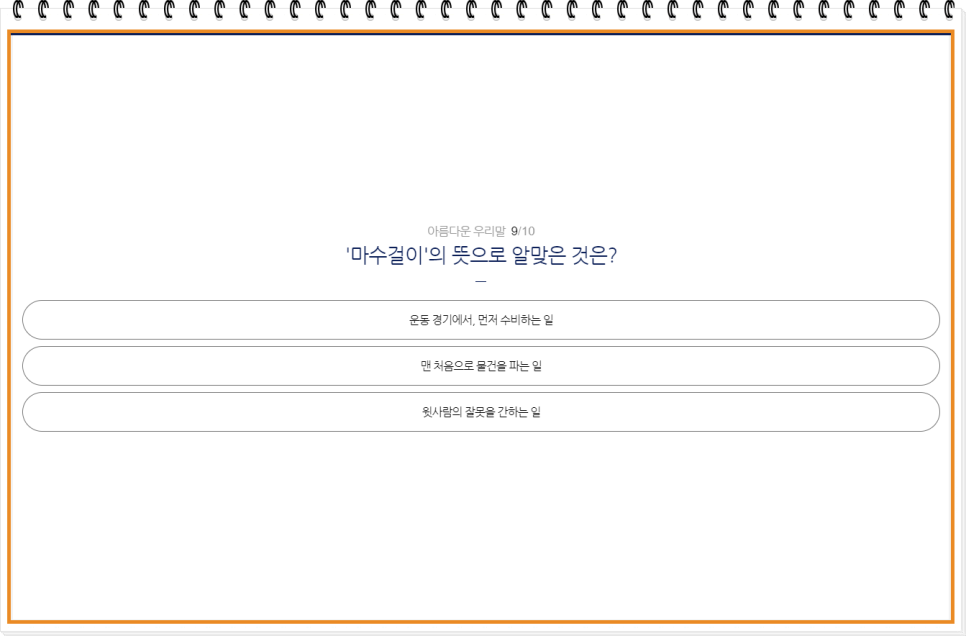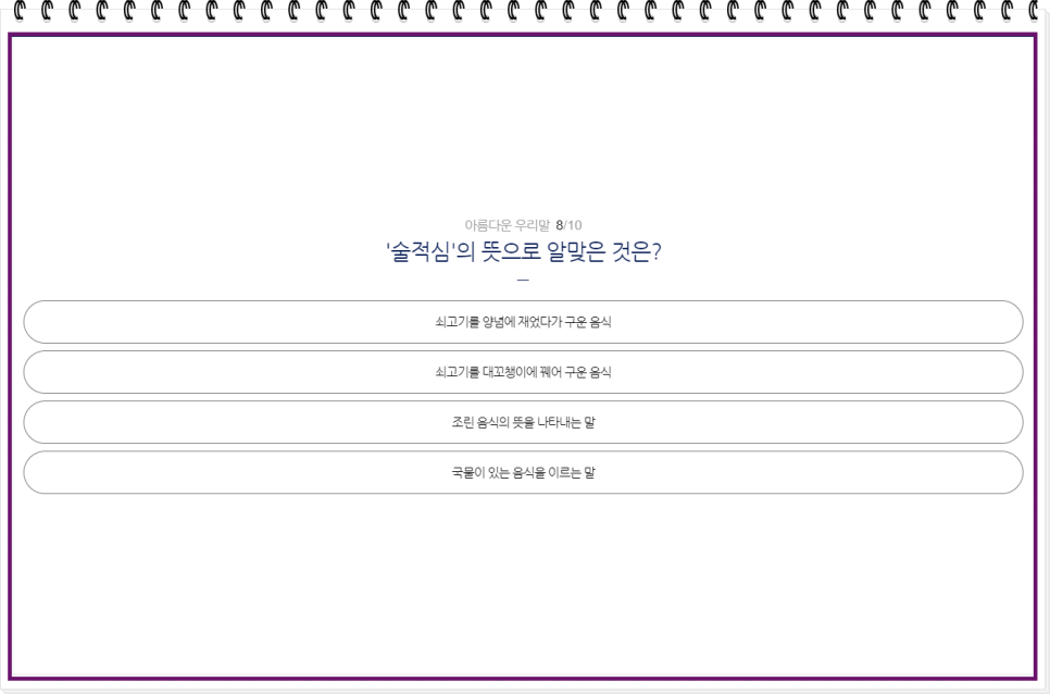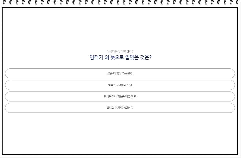 퀴즈가 끝났습니다! 끝까지 도전해 주신 여러분, 정말 수고 많으셨습니다. 퀴즈를 풀면서 순우리말에 대한 이해도가 높아졌나요? 이제 여러분은 더 자신 있게 한국어를 사용할 수 있겠죠? 이 퀴즈를 통해 우리말의 숨은 매력을 발견하고, 또 다른 순우리말을 배워가는 즐거움을 느끼셨기를 바랍니다. 계속해서 우리말의 아름다움을 함께 나누고, 더 많은 도전에 도전해 보세요!