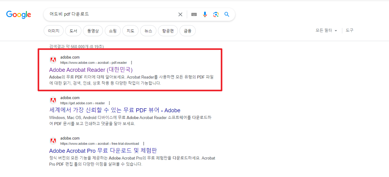 어도비 아크로뱃 리더 파일을 다운로드하는 방법을 알려드리겠습니다. 우선 구글 검색창에 어도비 pdf 다운로드 키워드를 검색하셔서 첫 번째 홈페이지에 접속합니다.