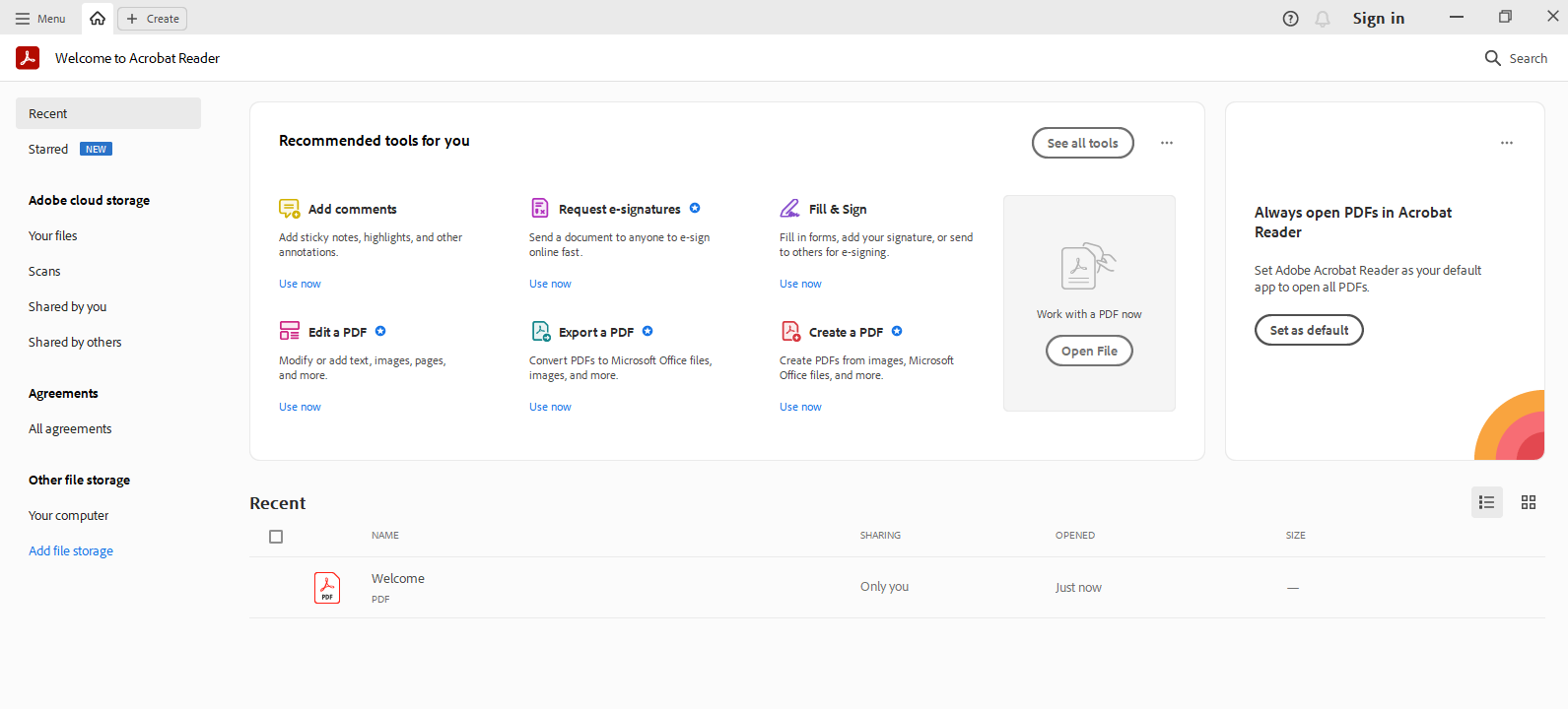 프로그램을 실행하시면 나오는 첫 화면입니다. 이제 어도비 아크로뱃 리더 파일을 통해 작업을 진행하시기 바랍니다.