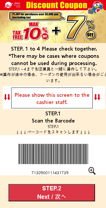 | 30,0000엔 이상 구입시 | 면세 10% 할인 + 7% 할인 | 면세 데스크 + 쿠폰 제시시 |