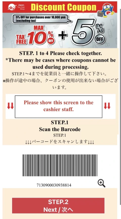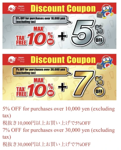 | 10,000엔 이상 30,000엔 미만 구입시 | 면세 10% 할인 + 5% 할인 | 면세 데스크 + 쿠폰 제시시 |