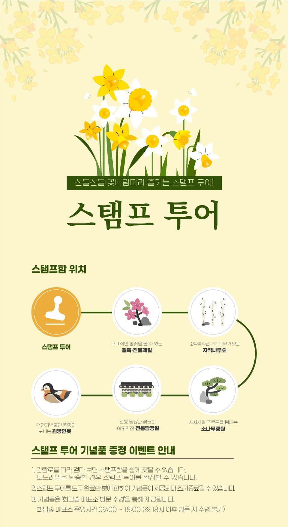 스탬프를 모을 수 있는 장소는 철쭉/진달래 길, 자작나무 숲, 소나무 정원, 전통담장길, 원앙연못입니다.