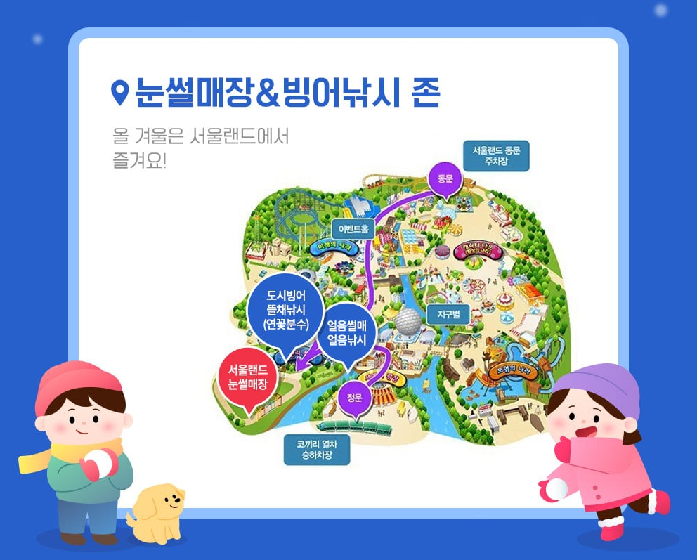 2. 서울랜드 눈썰매장의 유아용 슬로프는 키 120cm 이하만 입장 가능하며, 아동 보호자가 탑승이 가능합니다.